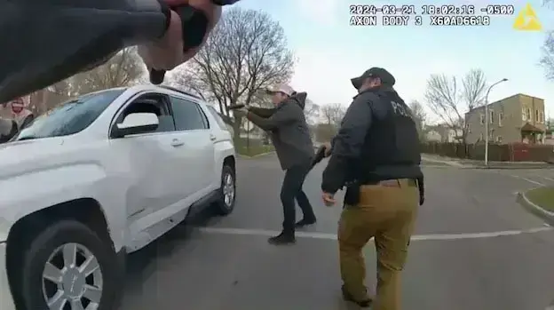 Ο αστυνομικός τραβάει το χερούλι της πόρτας του οδηγού – η οποία φαίνεται να είναι κλειδωμένη – και στη συνέχεια τραβάει ένα όπλο. «Ξεκλειδώστε τις πόρτες τώρα. Ξεκλειδώστε τις πόρτες τώρα» φωνάζει ο αστυνομικός, ενώ ένας άλλος αστυνομικός φωνάζει ακριβώς τα ίδια.