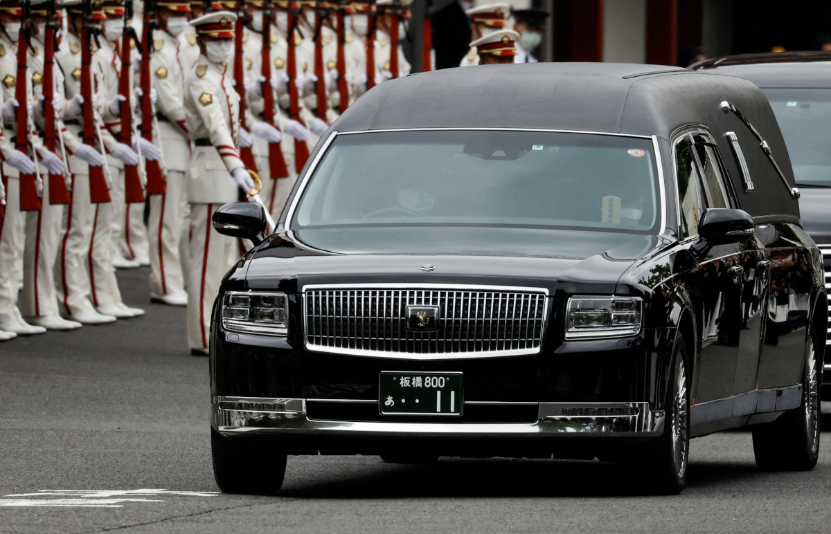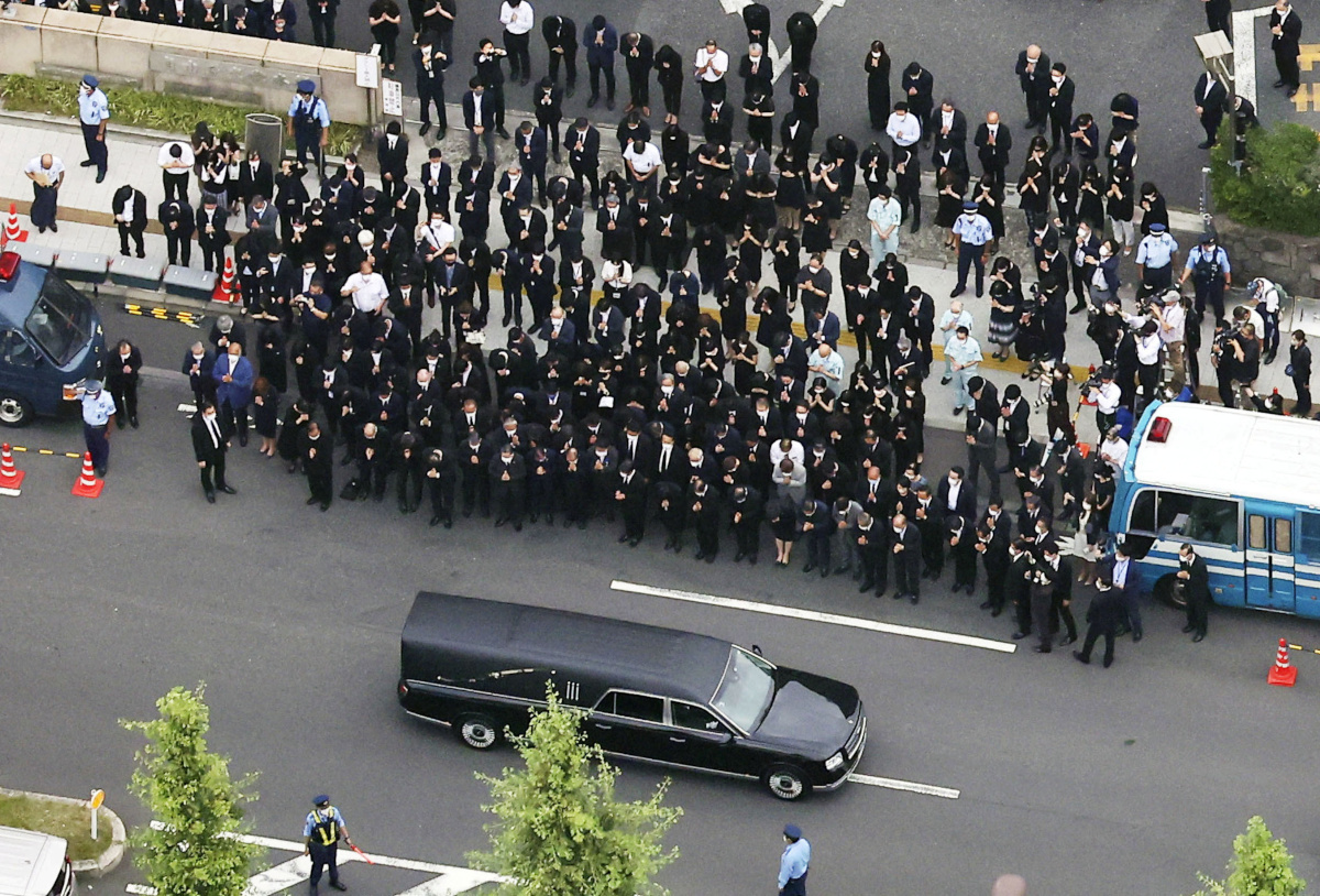 Πλήθος πολιτών είχε κατακλύσει τα πεζοδρόμια, ενώ είχε αναπτυχθεί ισχυρή αστυνομική παρουσία καθώς πλησίαζε η νεκροφόρα με τη σορό του πρώην πρωθυπουργού που είχε ξεκινήσει από ναό του κεντρικού Τόκιο.