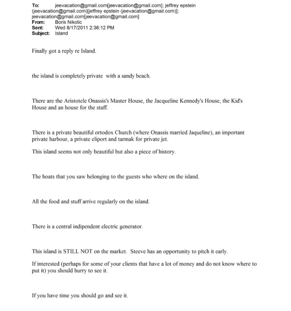 Στις 17 Αυγούστου 2011, ο Νίκολιτς ενημέρωσε τον Έπσταϊν ότι το νησί είναι εξ ολοκλήρου ιδιωτικό, διαθέτει κατοικίες, ελικοδρόμιο και σημαντική ιστορική αξία, συνδεδεμένη με τον Αριστοτέλη Ωνάση και την Τζάκι Κένεντι. Ακολούθησε ανταλλαγή μηνυμάτων με τον Ζιρό, με τον Έπσταϊν —που βρισκόταν τότε στην Ευρώπη— να ζητά πληροφορίες για το κοντινότερο αεροδρόμιο και την απομόνωση του νησιού.