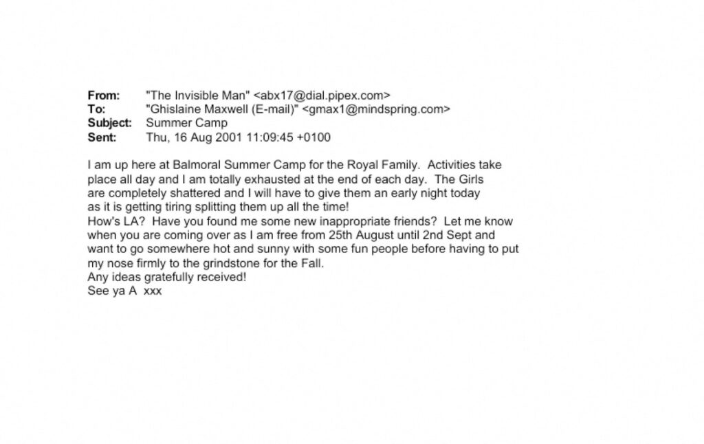 Το email, που στάλθηκε στις 16 Αυγούστου 2001, ξεκινά ως εξής: «Είμαι εδώ στο summer camp του Balmoral για τη βασιλική οικογένεια».