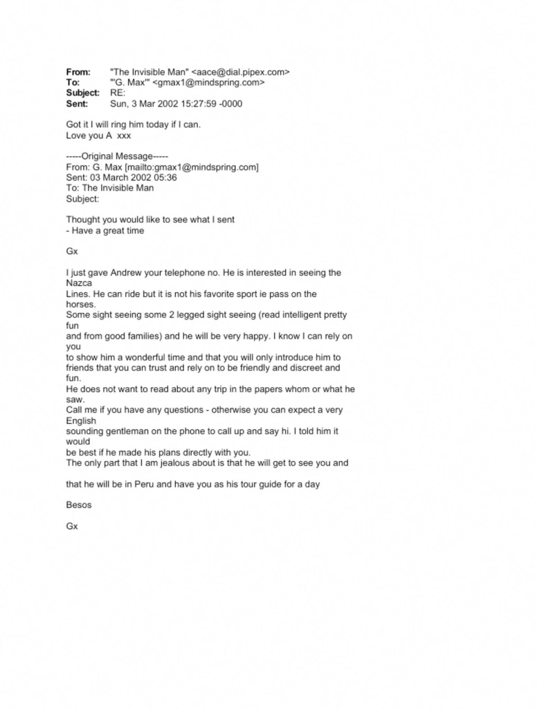 Σε ένα email που στάλθηκε στην ίδια διεύθυνση την ίδια μέρα, η Μάξουελ γράφει: «Λυπάμαι πολύ που σε απογοητεύω, αλλά η αλήθεια πρέπει να ειπωθεί. Μπόρεσα να βρω μόνο κατάλληλους φίλους».