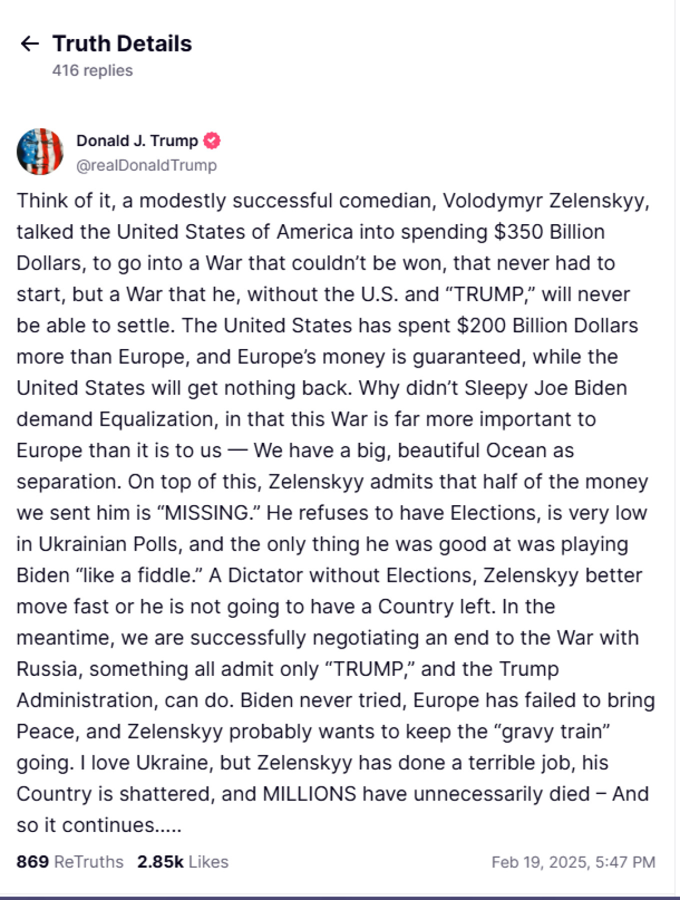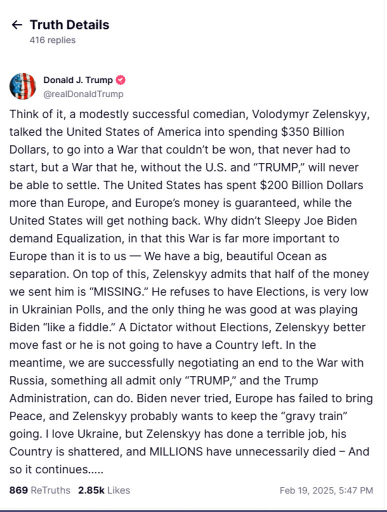 Αρνείται να κάνει εκλογές, είναι πολύ χαμηλά στις ουκρανικές δημοσκοπήσεις[…] Ένας δικτάτορας χωρίς Εκλογές, ο Ζελένσκι καλύτερα να κινηθεί γρήγορα, αλλιώς δεν πρόκειται να του απομείνει Χώρα. Εν τω μεταξύ, διαπραγματευόμαστε με επιτυχία τον τερματισμό του πολέμου με τη Ρωσία, κάτι που όλοι παραδέχονται ότι μόνο ο «ΤΡΑΜΠ» και η κυβέρνηση Τραμπ μπορούν να κάνουν. Ο Μπάιντεν δεν προσπάθησε ποτέ, η Ευρώπη απέτυχε να φέρει την Ειρήνη, και ο Ζελένσκι μάλλον θέλει να συνεχίσει το «τρένο της σπατάλης». Αγαπώ την Ουκρανία, αλλά ο Ζελένσκι έχει κάνει μια απαίσια δουλειά, η χώρα του είναι διαλυμένη και εκατομμύρια έχουν πεθάνει άσκοπα – Και έτσι συνεχίζεται…..».