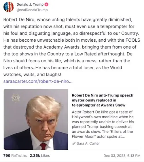 «Θα έπρεπε μάλιστα να μπουν σε ένα πλοίο μαζί με τον “Trump Deranged” Ρόμπερτ Ντε Νίρο, ένα ακόμη άρρωστο και διαταραγμένο άτομο με, πιστεύω, εξαιρετικά χαμηλό IQ, που δεν έχει απολύτως καμία ιδέα τι κάνει ή τι λέει — μερικά από τα οποία είναι σοβαρά ΕΓΚΛΗΜΑΤΙΚΑ!»