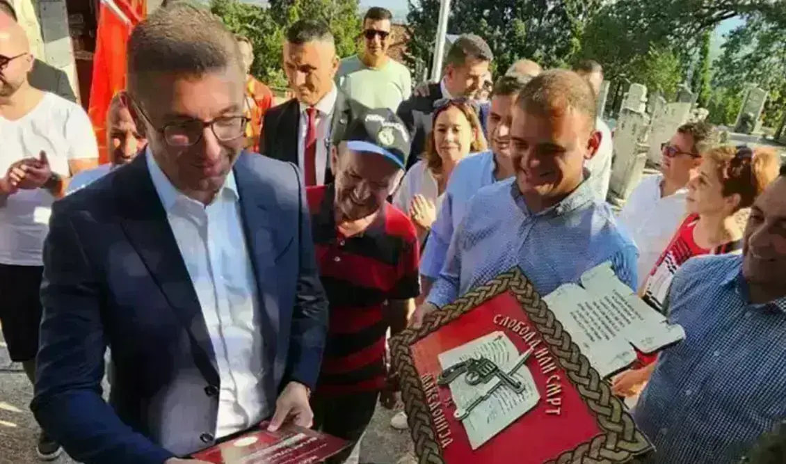 Ο Μίτσκοσκι φωτογραφήθηκε και με τη σημαία με τον ήλιο της Βεργίνας, σύμβολο του οποίου απαγορεύεται η χρήση, σύμφωνα με την Συμφωνία των Πρεσπών.