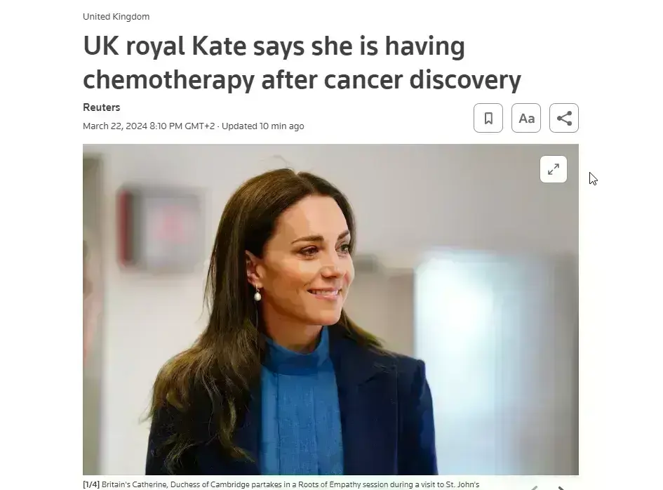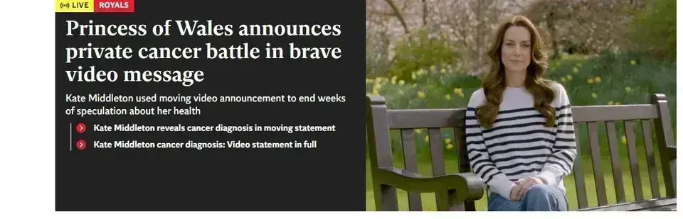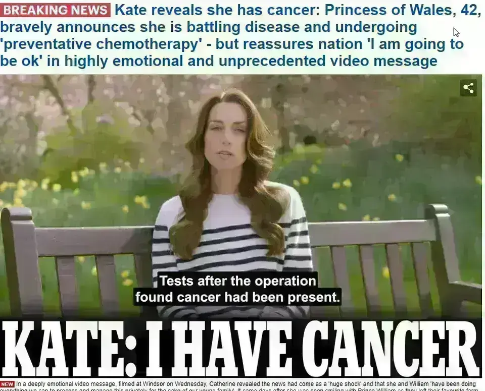 Η Daily Mail γράφει στον τίτλο: Η Κέιτ αποκάλυψε πως έχει καρκίνο. Η 42χρονη πριγκίπισσα της Ουαλίας, γενναία αν ανακοίνωσε πως δίνει μάχη με την ασθένεια και κάνει χημειοθεραπείες», προσθέτοντας την φράση της: «θα είμαι καλά».