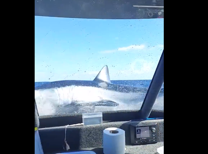 Στο βίντεο που έκανε τον γύρο του διαδικτύου φαίνεται ο καρχαρίας να πηδάει στην πλώρη και να σπαρταράει εγκλωβισμένος στα κάγκελα του σκάφους. Λίγο μετά σταμάτησε να κινείται.