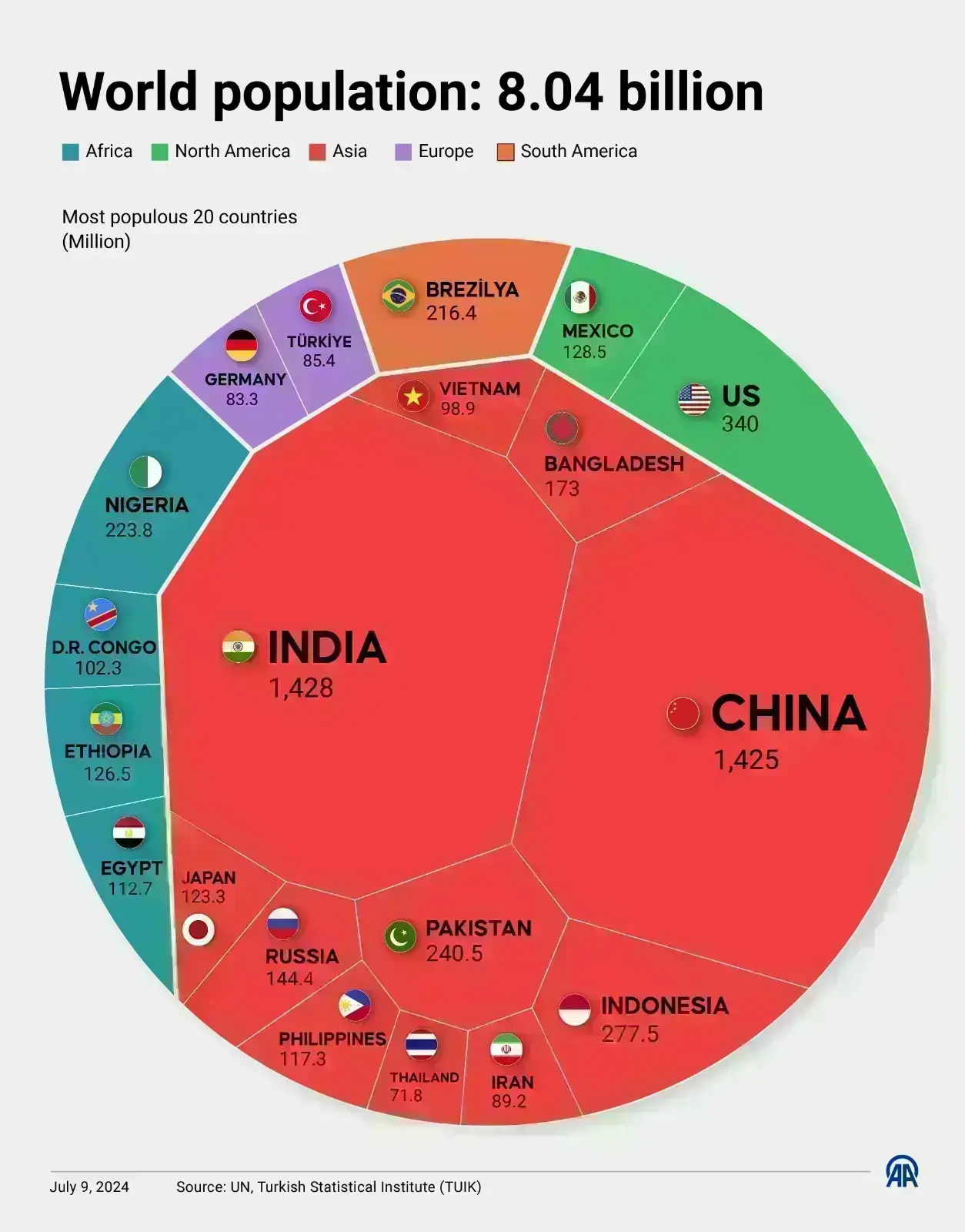 Η Ινδία ήταν η πολυπληθέστερη χώρα του κόσμου, με 1,43 δισεκατομμύρια κατοίκους, ακολουθούμενη από την Κίνα με ελαφρώς λιγότερους, 1,42 δισεκατομμύρια, και τις ΗΠΑ με 339,5 εκατομμύρια. Συνολικά οι τρεις πολυπληθέστερες χώρες αντιπροσωπεύουν το 39,7% του παγκόσμιου πληθυσμού το 2023, έδειξαν τα στοιχεία.