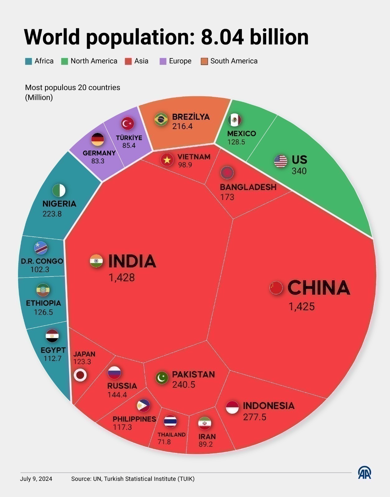 Με πληθυσμό 85,3 εκατομμυρίων ατόμων, η Τουρκία κατέλαβε την 18η θέση μεταξύ 194 χωρών με βάση το μέγεθος του πληθυσμού το 2023, σύμφωνα με στοιχεία της TurkStat, της τουρκικής στατιστικής υπηρεσίας, που δόθηκαν στη δημοσιότητα την Τρίτη ενόψει της 11ης Ιουλίου, της Παγκόσμιας Ημέρας Πληθυσμού, επικαλούμενη τις εκτιμήσεις του ΟΗΕ.