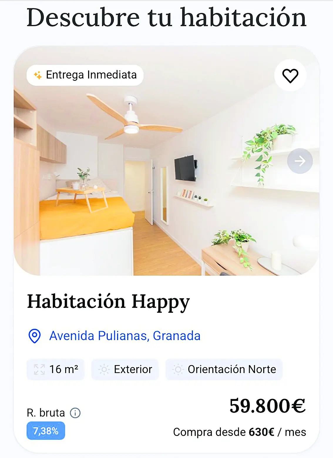 Στην Ισπανία, όσοι δεν μπορούν να αγοράσουν ολόκληρο σπίτι -ακόμα και γκαρσονιέρα- μπορούν μέσω της εταιρίας Habitacion να αγοράσουν ένα υπνοδωμάτιο σε ένα διαμέρισμα που θα μοιράζονται ακόμη και με αγνώστους. Στη Μαδρίτη, το κόστος κυμαίνεται περί τα 80.000 ευρώ, περίπου το ένα τρίτο της τιμής ενός δυαριού σήμερα. Πέρυσι, ο ιδρυτής της εταιρείας, Οριόλ Βαλς, πούλησε 200 υπνοδωμάτια και σήμερα έχει μια λίστα αναμονής με 32.000 υποψηφίους για αγορά σε επτά πόλεις.