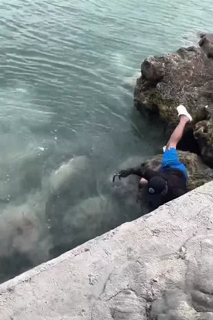 Ακολούθησε πανικός στο νερό, με τον ψαρά να προσπαθεί απεγνωσμένα να ξαναπιαστεί από τις πέτρες. Ο καρχαρίας, εν τω μεταξύ, γύριζε το κεφάλι του προσπαθώντας να δαγκώσει τον τρομαγμένο άντρα.