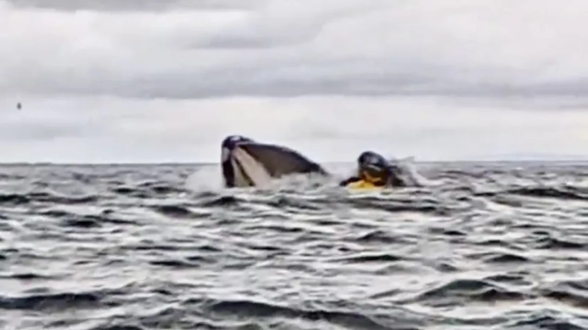 Ο 24χρονος Άντριαν, που έκανε ήρεμα πετάλι στις κυματιστές θάλασσες με το κίτρινο φουσκωτό του καγιάκ γύρω στις 3 μ.μ. τοπική ώρα, φαίνεται ξαφνικά να τον καταπίνουν τα σαγόνια της φάλαινας καμπούρας.