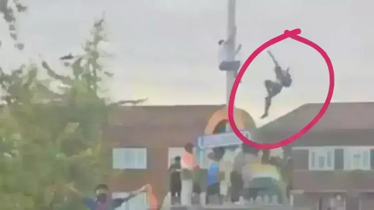 Οι θεατές ούρλιαξαν με τρόμο, αφού ο άνδρας, ο οποίος είχε σκαρφαλώσει στο κοντάρι σε μια προσπάθεια να δέσει μια σημαία, έχασε τη λαβή του πριν εκτοξευθεί στο πεζοδρόμιο από κάτω.
