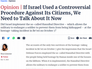 Οι αποκαλύψεις ότι ο ισραηλινός στρατός έδωσε διαταγές ν’ αγνοηθούν οι ζωές των ισραηλινών αιχμαλώτων έχουν προκαλέσει τεράστια αναστάτωση στο Ισραήλ (Haaretz, 13/12/23).