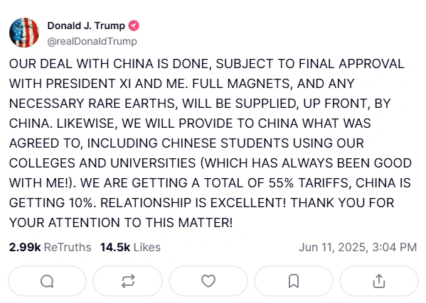 Όλες οι σπάνιες γαίες θα προμηθεύονται εκ των προτέρων από την Κίνα. Ομοίως, θα παρέχουμε στην Κίνα ό,τι συμφωνήθηκε, συμπεριλαμβανομένης της άδειας να φοιτούν στα κολέγια και Πανεπιστήμιά μας Κινέζοι φοιτητές (κάτι με το οποίο δεν είχα ποτέ πρόβλημα!).