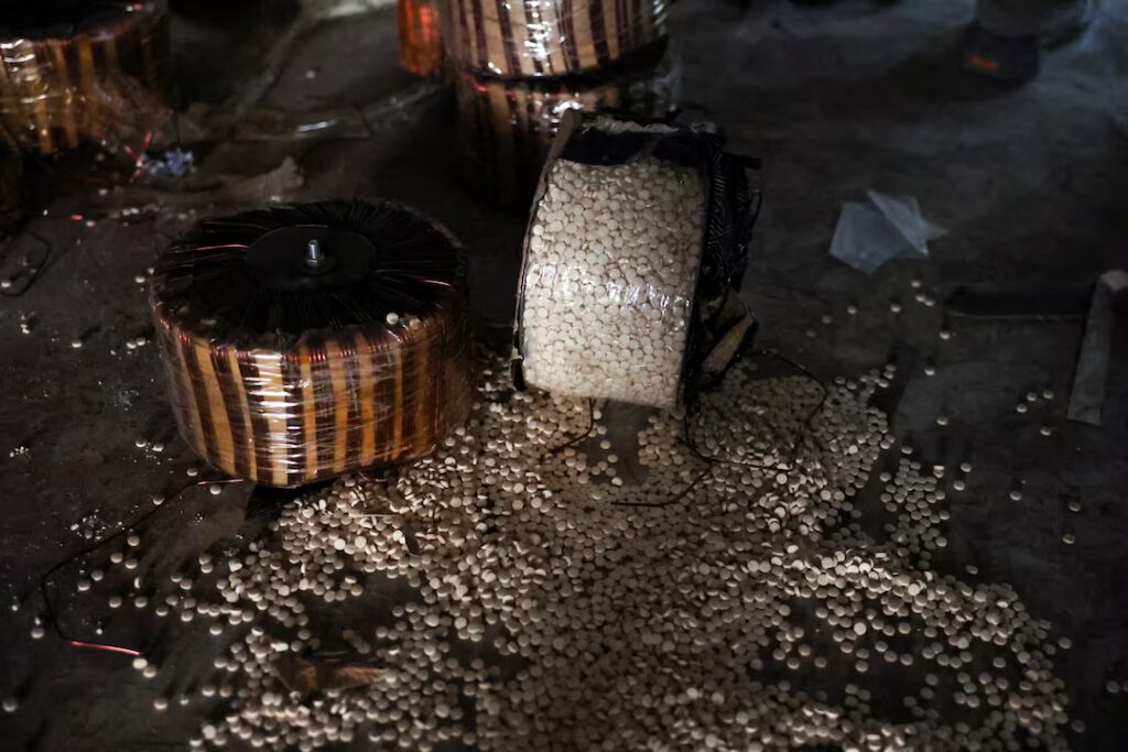 Στην αποθήκη, τα κιβώτια που έκρυβαν το περιεχόμενο των φορτίων του ναρκωτικού παραμένουν εκεί, όπως και οι σάκοι της καυστικής σόδας – που προέρχεται, σύμφωνα με τις ετικέτες, από την Σαουδική Αραβία – βασικού συστατικού της μεθαμφεταμίνης, διεγερτικού όπως και το captagon.