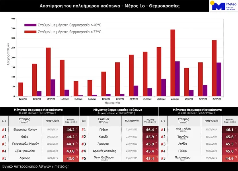 Στο διάγραμμα που ακολουθεί, σύμφωνα με τις καταγραφές του δικτύου αυτόματων μετεωρολογικών σταθμών του Εθνικού Αστεροσκοπείου Αθηνών/ Meteo.gr, παρουσιάζεται ο αριθμός των σταθμών όπου η θερμοκρασία ξεπέρασε τους 37 °C και τους 40 °C (κόκκινες και μωβ μπάρες, αντίστοιχα).
