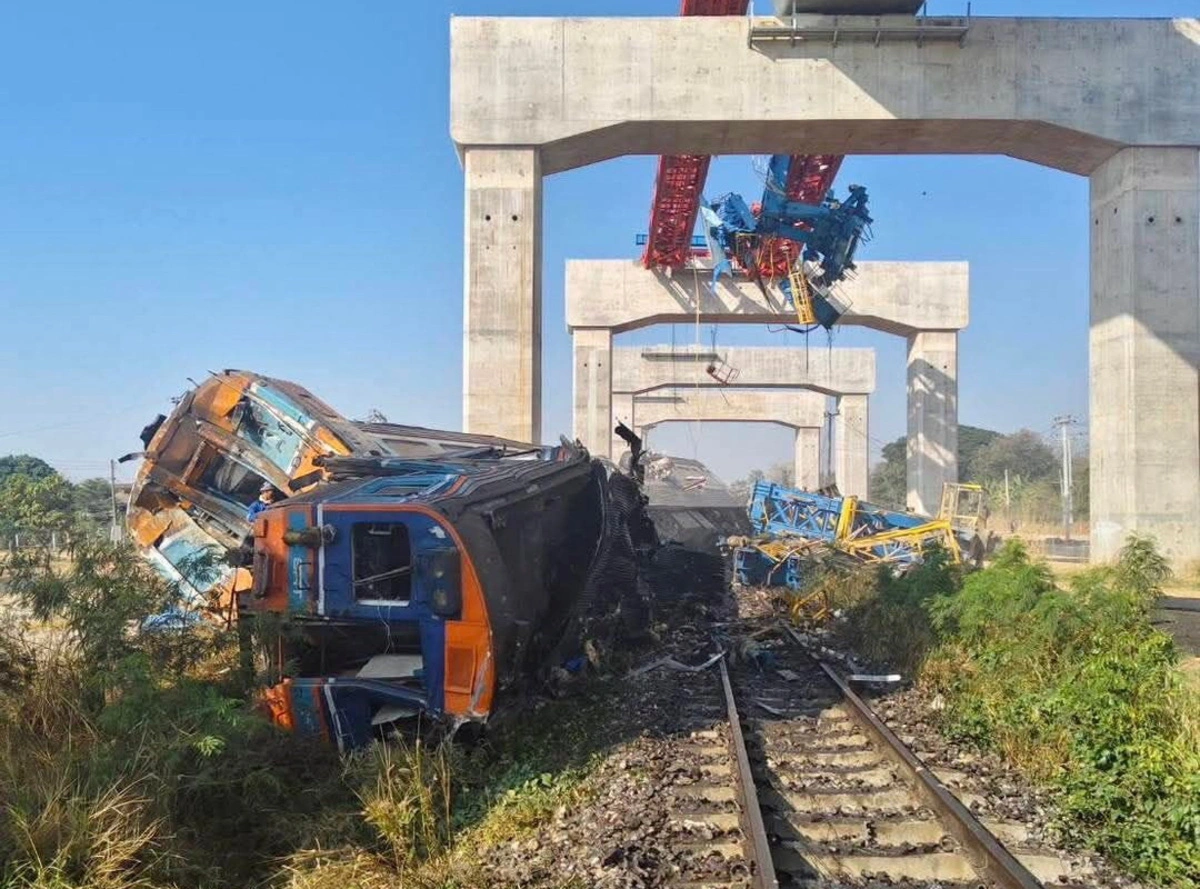 At least 12 people were killed after a construction crane collapsed onto a Bangkok–Ubon Ratchathani passenger train, derailing the train and triggering a fire, according to the State Railway of Thailand (SRT).