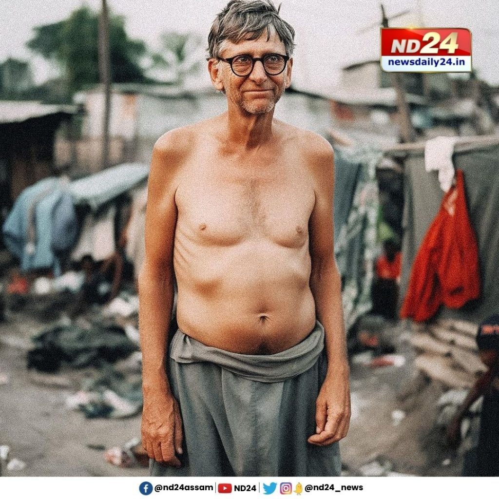Στο φωτογραφικό κολάζ, ο Αμερικανός επιχειρηματίας και συνιδρυτής της Microsoft, Μπιλ Γκέιτς, 67 ετών, εμφανίζεται γυμνόστηθος και φορώντας μόνο ένα γκρίζο παντελόνι που έμοιαζε σαν σακί, να στέκεται έξω από μια παράγκα.