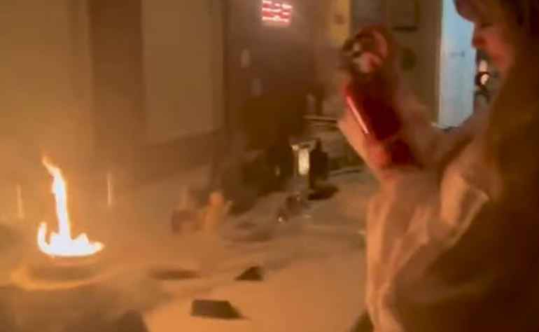 «Τι να κάνω γι’ αυτό τώρα;» ρωτά με αγωνία η 34χρονη Σουίφτ στο βίντεο καθώς περπατούσε στην κουζίνα της κρατώντας έναν πυροσβεστήρα τον οποίο δεν ήξερε να χρησιμοποιήσει. «Να το κόψω αυτό με ένα μαχαίρι; Νομίζω ότι θα πεθάνουμε»