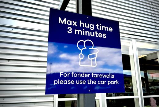 Έχουν ανέβει ταμπέλες που ενημερώνουν τους ανθρώπους που αποχαιρετούν τα αγαπημένα τους πρόσωπα ότι ο νέος κανόνας είναι “Μέγιστος χρόνος αγκαλιάς τρία λεπτά” ή “Είναι δύσκολο να πεις αντίο, οπότε κάνε το γρήγορα. 3 λεπτά το πολύ”.