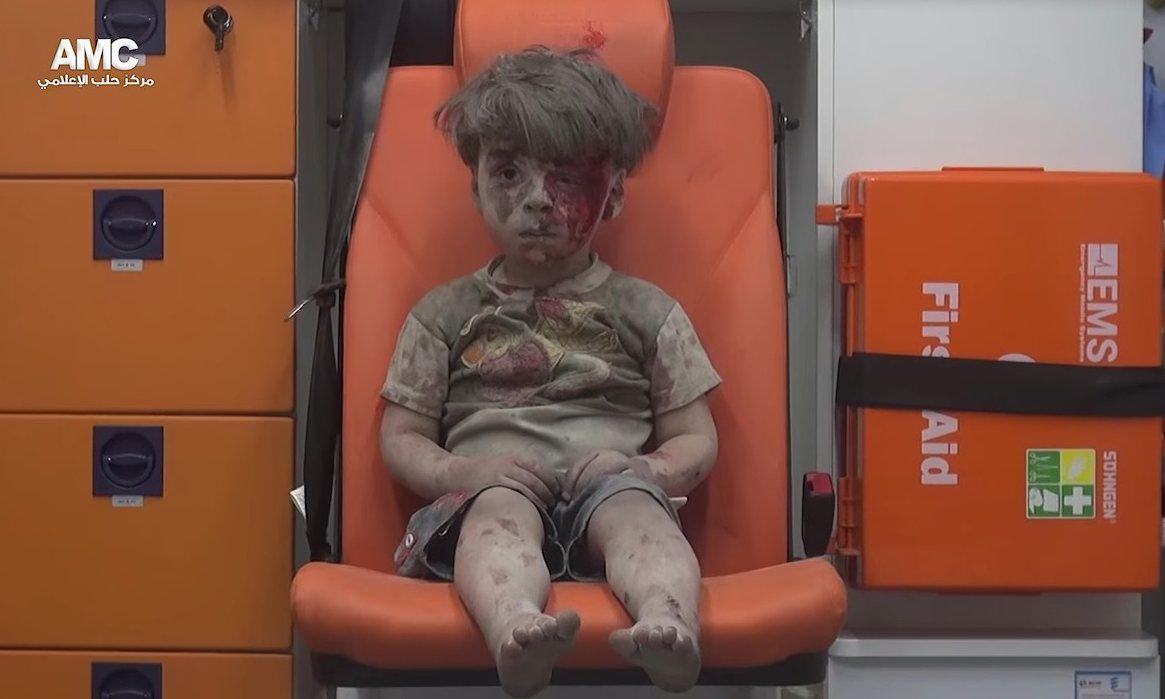 Φυσικά, πρόκειται για μοντάζ ευφάνταστου χρήστη των κοινωνικών δικτύων, που θεώρησε ότι η δραματική διάσωση του πεντάχρονου αγοριού από την κόλαση του Χαλεπίου θα έπρεπε να ευαισθητοποιήσει τους ισχυρούς ηγέτες, ώστε να παρέμβουν αποφασιστικά για να σταματήσει η αιματοχυσία.