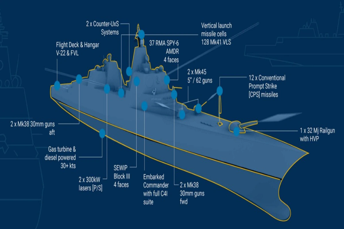 Το πολεμικό πλοίο θα είναι ένα από τα μεγαλύτερα του Πολεμικού Ναυτικού: θα έχει μήκος 880 πόδια και εκτόπισμα 35.000 τόνους νερού, με πλήρωμα έως 850 άτομα. Συγκριτικά, το αντιτορπιλικό κλάσης Arleigh Burke έχει μήκος 505 πόδια και εκτόπισμα 10.000 τόνους.