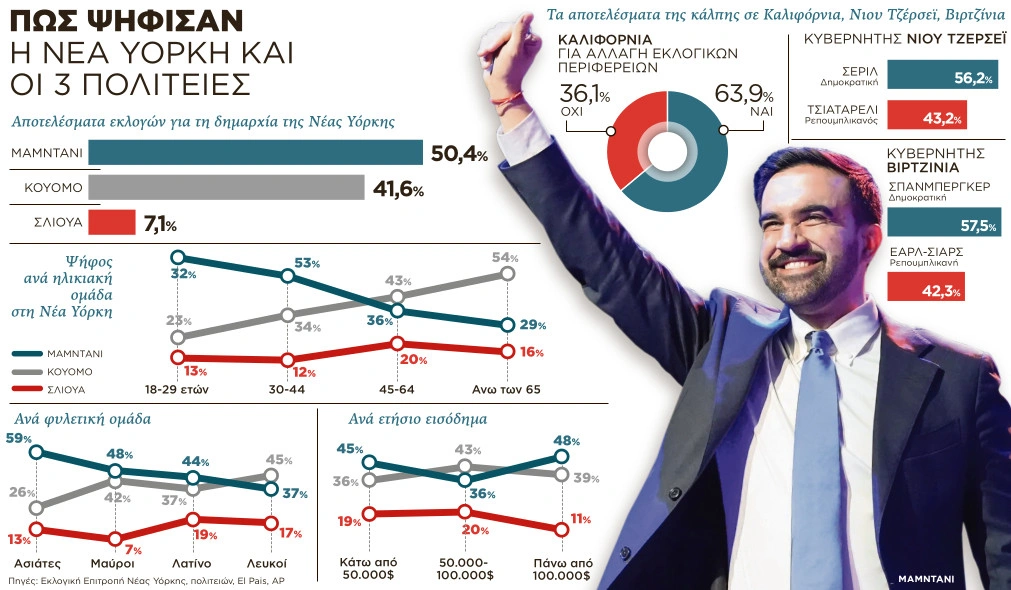 Στη Νέα Υόρκη, ο 34χρονος Δημοκρατικός σοσιαλιστής, όπως συστήνεται, o Ζοράν Μαμντάνι, έγραψε Ιστορία. Ενας άγνωστος μέχρι πρότινος με τροχιά μετεωρίτη, σε έξι μήνες γίνεται ο πρώτος μουσουλμάνος και ο πρώτος νιοτιοασιατικής καταγωγής δήμαρχος στη Νέα Υόρκη, τη μεγαλύτερη πόλη σε πληθυσμό στις ΗΠΑ, μία πόλη που φιλοξενεί τη μεγαλύτερη εβραϊκή κοινότητα εκτός Ισραήλ, τη μητρόπολη του καπιταλισμού. Κέρδισε με διαφορά τον κύριο αντίπαλό του, τον Δημοκρατικό επίσης πρώην κυβερνήτη Αντριου Κουόμο, που εκπροσωπούσε το παλιό, το κατεστημένο του κόμματος και την ελίτ, όπως τον παρουσίαζε, για να υπογραμμίσει την αντίθεση με το νέο, την αλλαγή που υποσχέθηκε στην επινίκια ομιλία του. «Σε μια περίοδο πολιτικού σκότους, η Νέα Υόρκη είναι το φως. Η ελπίδα είναι ζωντανή, νίκησε την τυραννία. Θα κερδίσουμε τον πόλεμο ενάντια στον αυταρχισμό και την ολιγαρχία δίνοντας λύσεις στα προβλήματα», δήλωσε, προκαλώντας τον Τραμπ να δυναμώσει την ένταση του ήχου, για να ακούσει καθαρά το μήνυμα από την πόλη που τον έκανε αυτό που είναι σήμερα, όπως τόνισε.