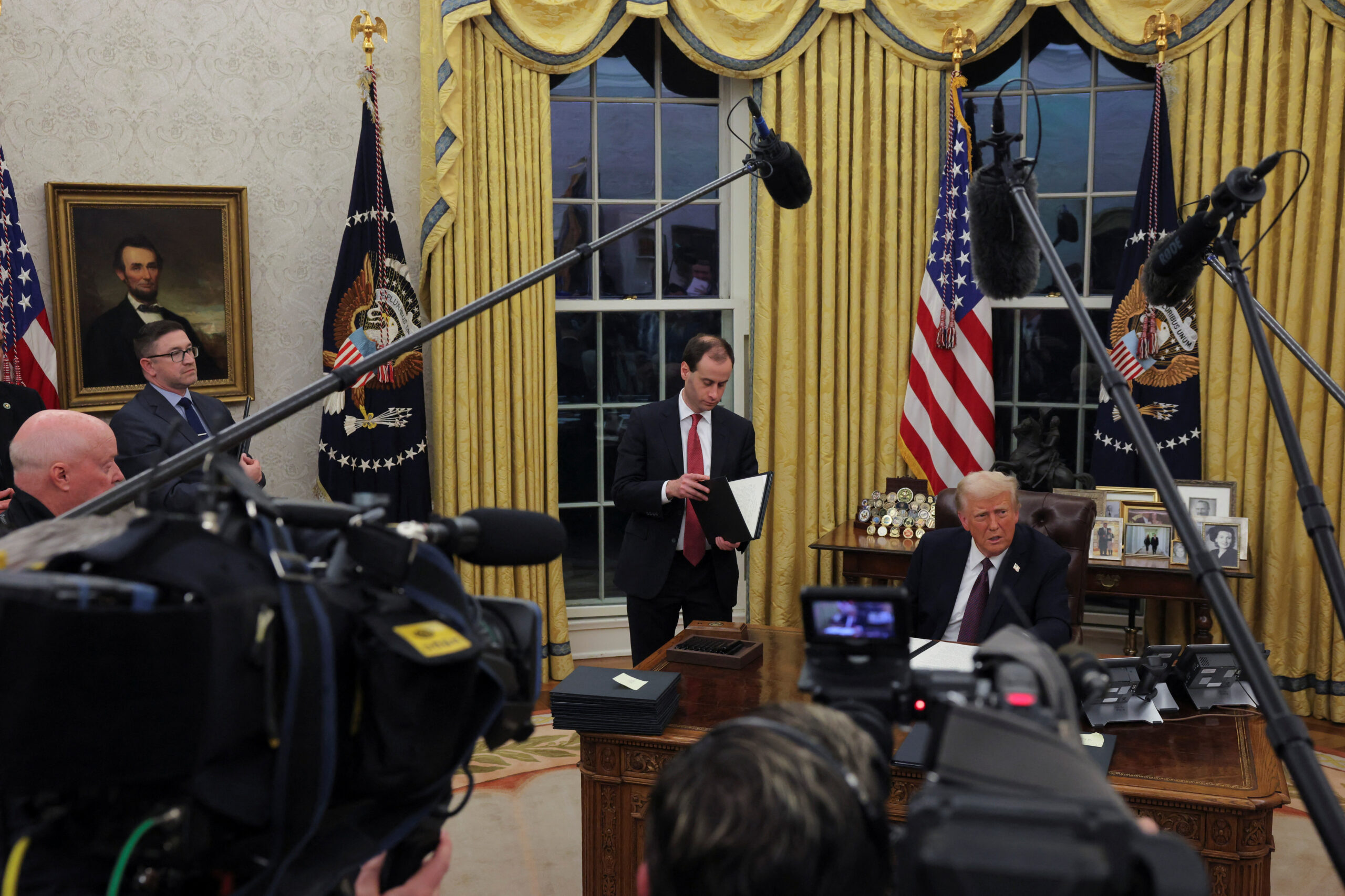 Ο σύμβουλος συνεχίζει να του δίνει έγγραφα. «Αυτό είναι σημαντικό», λέει ο Τραμπ, ο οποίος δεν χάνει ευκαιρία να εκτοξεύσει πυρά κατά των μεταναστών, προτού υπογράψει ένα διάταγμα που αμφισβητεί το δίκαιο του εδάφους, το οποίο έχει χαρακτηρίσει «γελοίο», που όμως προστατεύεται από το αμερικανικό Σύνταγμα.