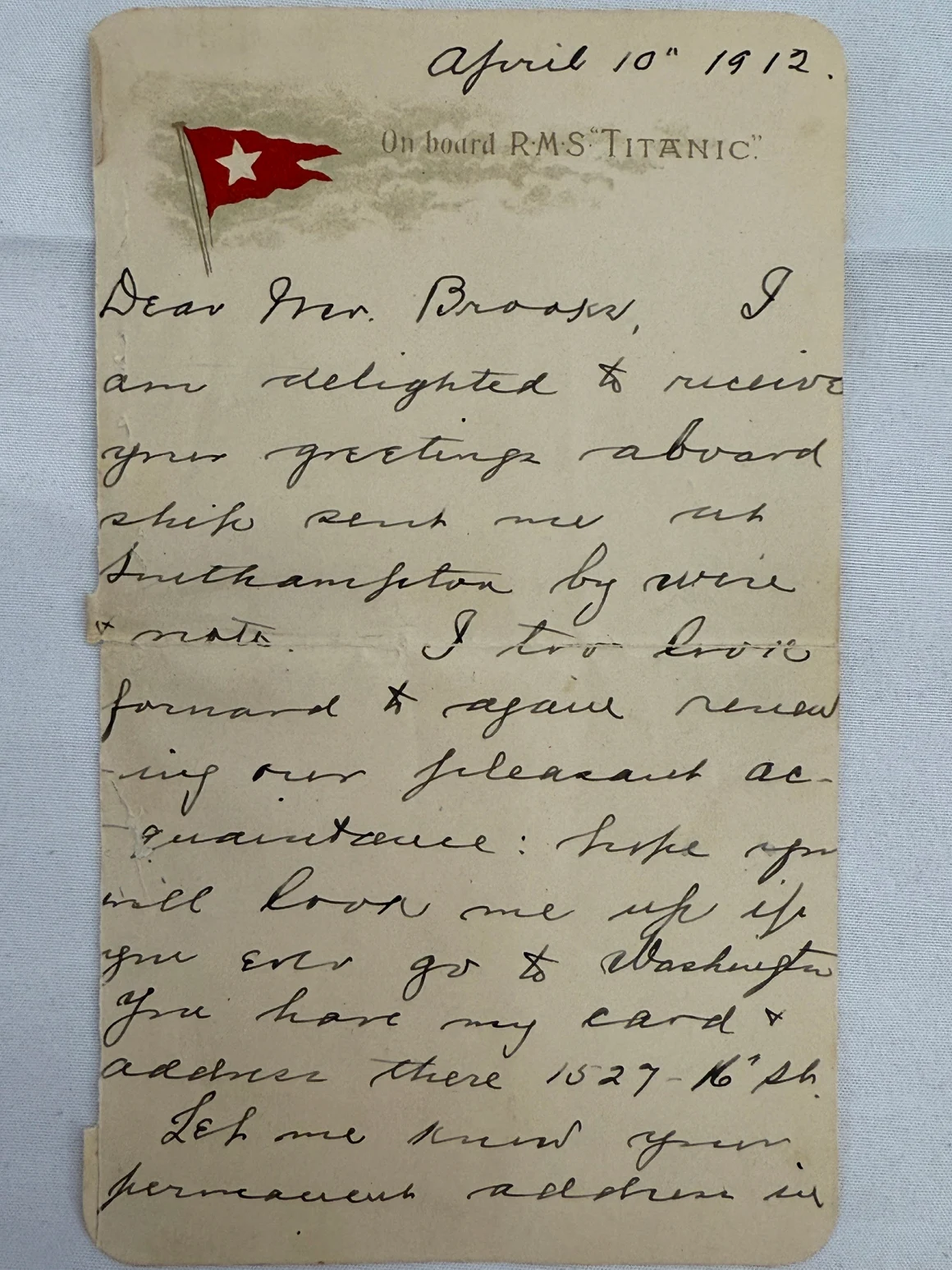 Το γράμμα, που φέρει σφραγίδα ταχυδρομείου από το Κουίνσταουν, Ιρλανδία, είναι από τα τελευταία μέρη που σταμάτησε το πλοίο πριν βυθιστεί τις πρώτες ώρες της 13ης Απριλίου 1912.