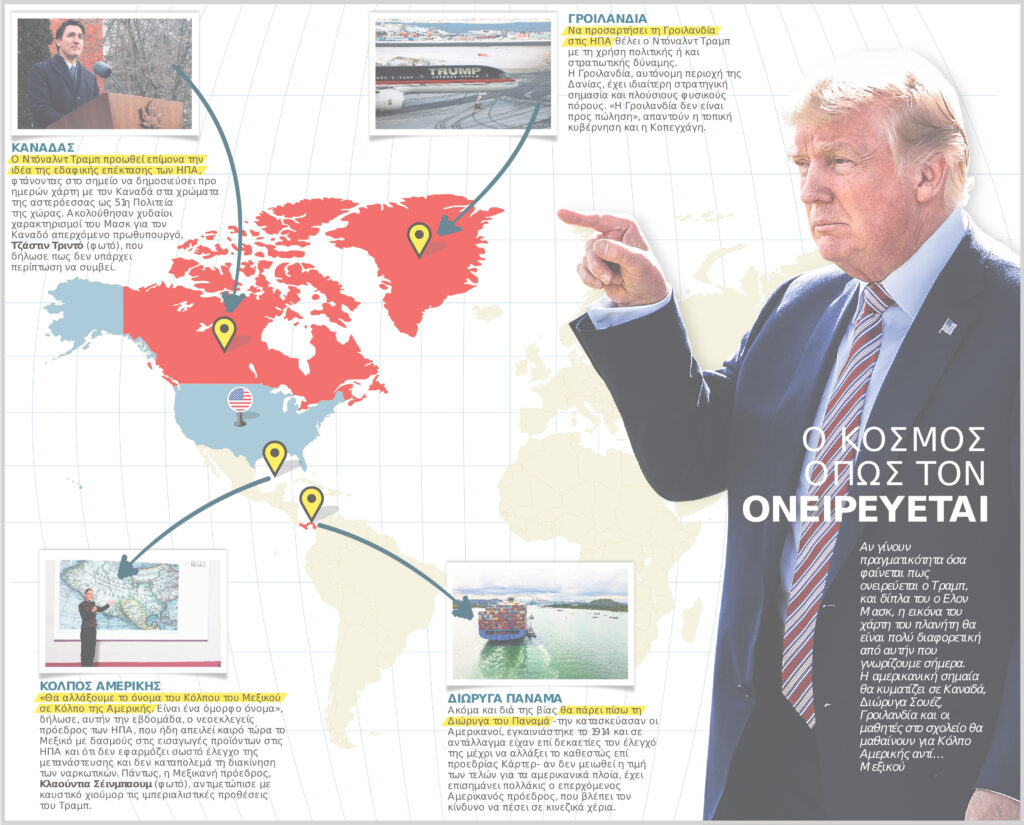 Κι όμως, πριν καν ορκιστεί στις 20 Ιανουαρίου ο maximus Τραμπ υιοθέτησε μια ιμπεριαλιστική ατζέντα. Προκειμένου να «προασπίσει τα συμφέροντα των ΗΠΑ», απειλεί πως θα προσθέσει στην επικράτειά τους τη Γροιλανδία και τη Διώρυγα του Παναμά, χωρίς να αποκλείσει, μάλιστα, το ενδεχόμενο χρήσης στρατιωτικής βίας, καθώς και τον Καναδά, που σκοπεύει να «πείσει» να γίνει η 51η Πολιτεία με τακτική καρότου και μαστιγίου, απειλώντας με δασμούς και υποσχόμενους χαμηλότερους φόρους στους πολίτες.