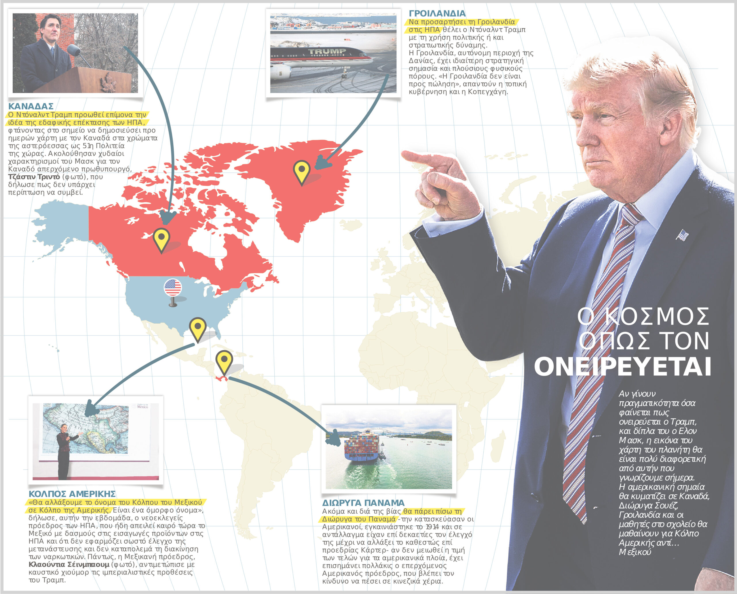 «Αν διαγράψουμε αυτήν την τεχνητή γραμμή μεταξύ ΗΠΑ-Καναδά, όλα θα είναι τόσο όμορφα», είπε προ ημερών ο Τραμπ για τον Καναδά και εν συνεχεία ανήρτησε στα μέσα κοινωνικής δικτύωσης χάρτη που δείχνει τη γειτονική χώρα προσαρτημένη. «Οι Γροιλανδοί πολίτες θέλουν να γίνουν Αμερικανοί», είπε για το νησί που είναι υπερπόντιο έδαφος της Δανίας, προσθέτοντας πως, αν δεν γίνει αποδεκτή προσφορά για αγορά, μπορεί να γίνει η αλλαγή και με τα όπλα.