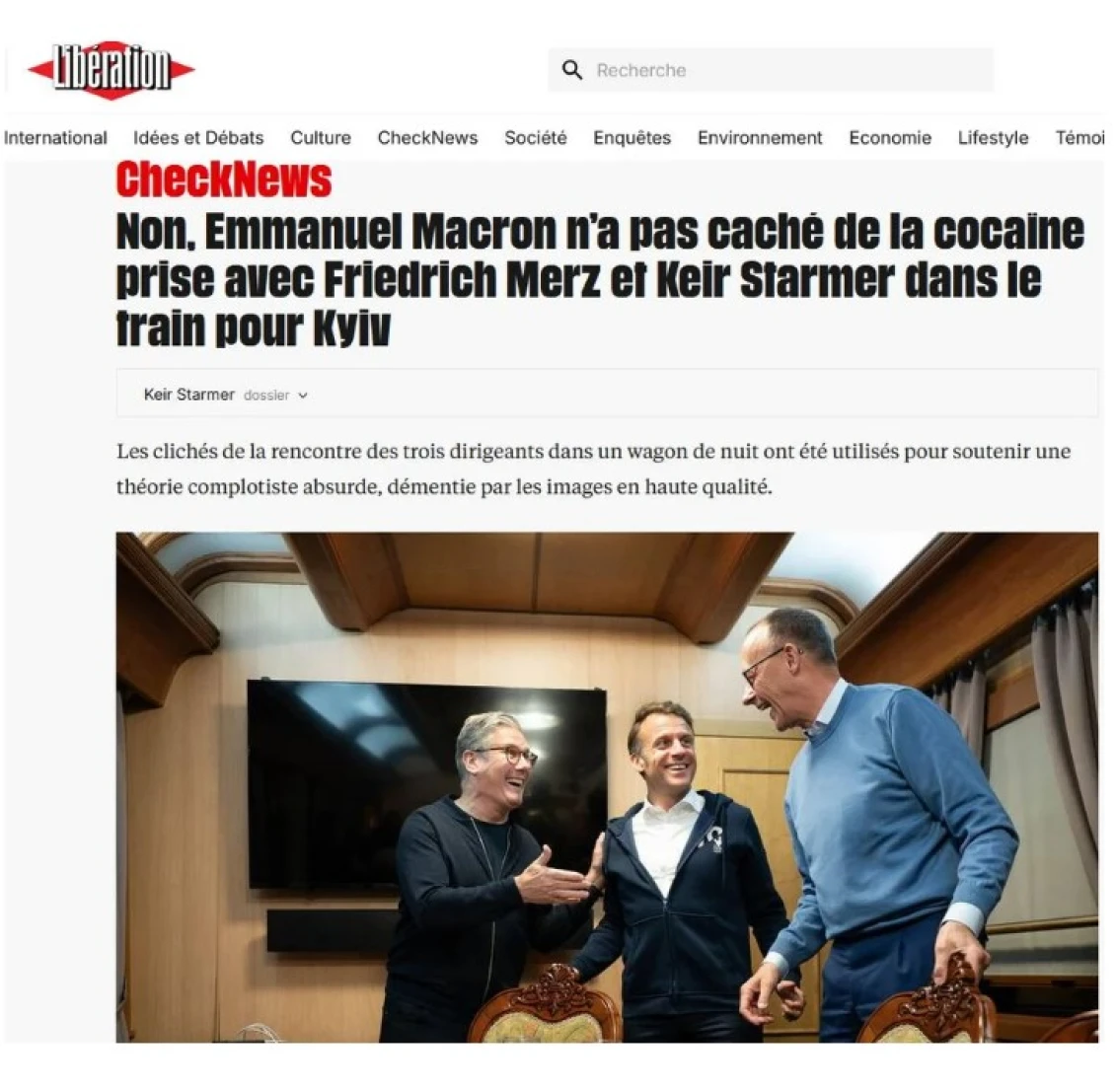 Ενα βίντεο από το ταξίδι τους με το τρένο πυροδότησε θεωρίες συνωμοσίας ότι ο Μακρόν και άλλοι ηγέτες έκαναν χρήση κοκαΐνης. Στα πλάνα διακρίνεται ο Μακρόν να απομακρύνει κάτι λευκό από το τραπέζι και ο Μερτς ένα άλλο αντικείμενο, καθώς υποδέχονταν τον Στάρμερ, με ακροδεξιούς και φιλορωσικούς λογαριασμούς στα μέσα κοινωνικής δικτύωσης να υποστηρίζουν ότι ο Γάλλος πρόεδρος εξαφάνισε μπροστά από τις κάμερες ένα σακουλάκι με… κοκαΐνη και ο Μερτς ένα κουταλάκι που είχαν χρησιμοποιήσει για να κάνουν χρήση του ναρκωτικού. Τα faker news υιοθετήθηκαν ακόμη και από την εκπρόσωπο του ρωσικού υπουργείου Εξωτερικών, Μαρία Ζαχάροβα, με ανάρτησή της στο Telegram, όπου έγραψε: «(…) αφού έσπρωξα τον Ζελένσκι σε μια αστεία ίντριγκα για να συνεχιστεί η αιματοχυσία, ο Γάλλος, ο Άγγλος και ο Γερμανός μπήκαν στο τρένο και… φούμαραν. Και το έκαναν τόσο πολύ που ξέχασαν να κρύψουν τα εργαλεία τους (μια σακούλα και ένα κουτάλι) πριν να φτάσουν οι δημοσιογράφοι».