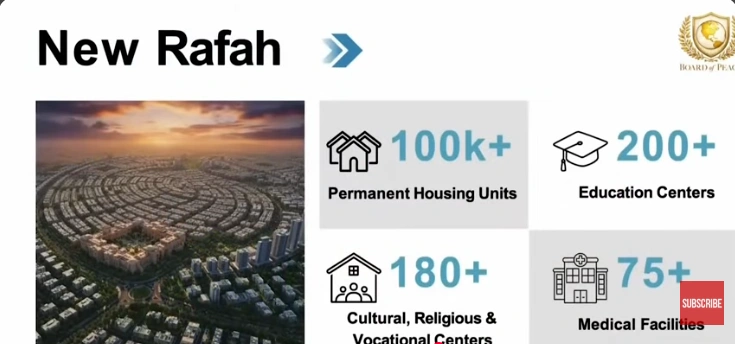 Οι διαφάνειες περιλάμβαναν μια εικόνα της μεσογειακής ακτογραμμής γεμάτη με λαμπερούς ουρανοξύστες παρόμοιους με αυτούς του Ντουμπάι ή της Σιγκαπούρης. Υποδείκνυαν ότι η ανασυγκρότηση θα ξεκινούσε από τη Ράφα στο νότο, μια περιοχή που βρίσκεται υπό τον πλήρη στρατιωτικό έλεγχο του Ισραήλ.
