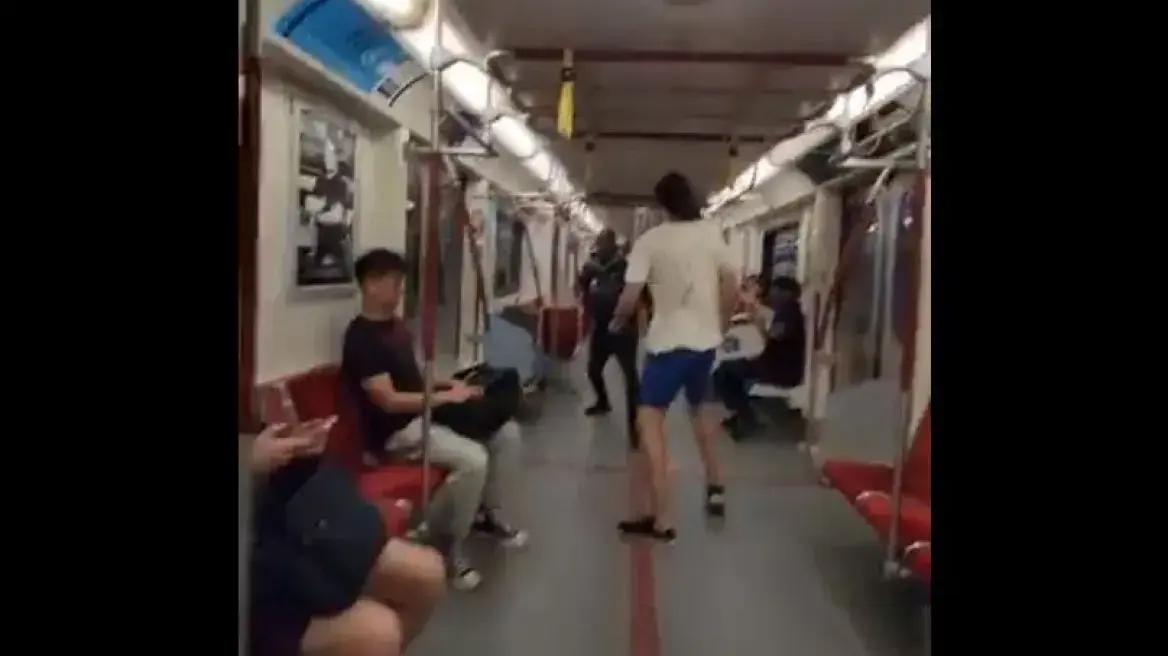 Ειδικότερα, βίντεο από κινητό τηλέφωνο που κατέγραψε αυτόπτης μάρτυρας και κοινοποιήθηκε ευρέως στα μέσα κοινωνικής δικτύωσης δείχνει έναν άνδρα με λευκό μπλουζάκι και μπλε σορτσάκι να ανταλλάσσει γροθιές και κλωτσιές με έναν άλλο επιβάτη ντυμένο με σκούρα ρούχα στη μέση ενός συρμού.