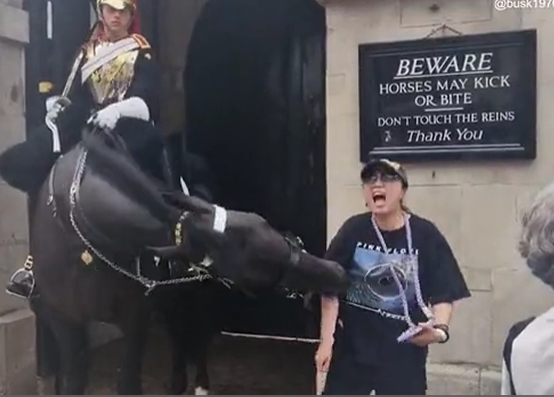 Ο λόγος για μία τουρίστρια, η οποία παρά την προειδοποιητική πινακίδα «Προσοχή, τα άλογα μπορεί να σας κλωτσήσουν ή να σας δαγκώσουν», πλησιάζει πολύ κοντά σε ένα από αυτά και στήνεται για φωτογραφία.