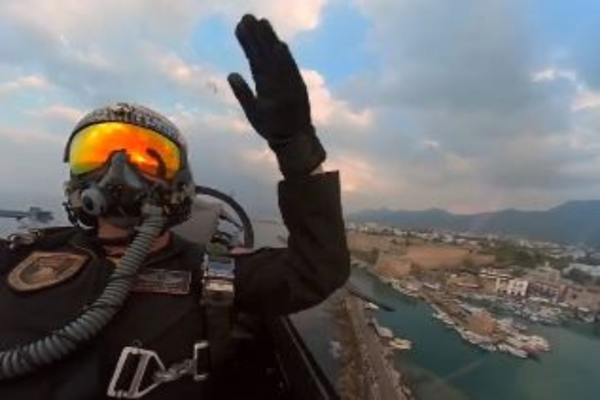 Στο βίντεο διακρίνεται ο Τούρκος πιλότος να χαιρετά την σημαία του ψευδοκράτους, η οποία επίσης φαίνεται ξεκάθαρα στον Πενταδάκτυλο.