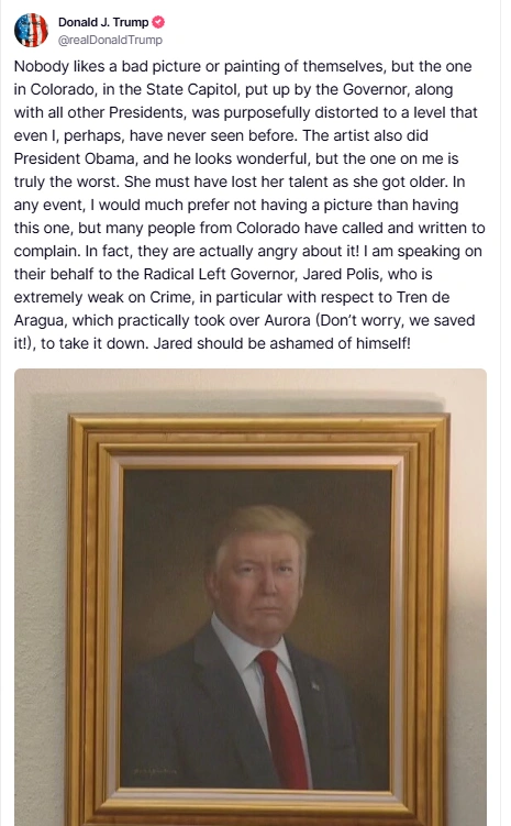 «Σε κανέναν δεν αρέσει μια κακή εικόνα ή πίνακας του εαυτού του, αλλά αυτός στο Κολοράντο, στο Καπιτώλιο της Πολιτείας, που έβαλε ο κυβερνήτης, μαζί με όλους τους άλλους προέδρους, ήταν σκόπιμα παραμορφωμένος σε ένα επίπεδο που ούτε εγώ, ίσως, δεν έχω ξαναδεί», έγραψε οργισμένος.