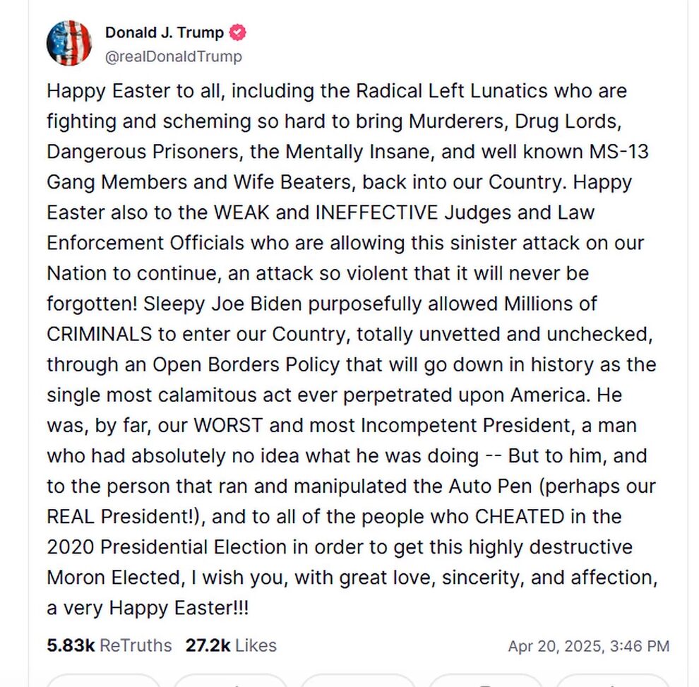 «Καλό Πάσχα σε όλους, συμπεριλαμβανομένων των Ριζοσπαστικών Αριστερών Παλαβών που παλεύουν και στέκονται σθεναρά εμπόδιο για να φέρουν Δολοφόνους, Βαρόνους Ναρκωτικών, Επικίνδυνους Φυλακισμένους, Ψυχικά Παράφρονες και γνωστά μέλη της συμμορίας MS-13 και ανθρώπους που κακοποιούν τις συζύγους τους, πίσω στη χώρα μας. Καλό Πάσχα και στους ΑΔΥΝΑΜΟΥΣ και ΑΝΑΠΟΤΕΛΕΣΜΑΤΙΚΟΥΣ Δικαστές και Αξιωματούχους Επιβολής του Νόμου που επιτρέπουν να συνεχιστεί αυτή η απαίσια επίθεση στο Έθνος μας, μια επίθεση τόσο βίαιη που δεν θα ξεχαστεί ποτέ! Ο κοιμισμένος Τζο Μπάιντεν επέτρεψε σκόπιμα σε Εκατομμύρια ΕΓΚΛΗΜΑΤΙΕΣ να εισέλθουν στη χώρα μας, εντελώς ανεξέλεγκτοι, μέσω μιας Πολιτικής Ανοικτών Συνόρων που θα μείνει στην ιστορία ως η μοναδική πιο καταστροφική πράξη που διαπράχθηκε ποτέ στην Αμερική. Ήταν, μακράν, ο ΧΕΙΡΟΤΕΡΟΣ και πιο ανίκανος Πρόεδρός μας, ένας άνθρωπος που δεν είχε απολύτως καμία ιδέα τι έκανε — Αλλά για αυτόν και για το άτομο που έτρεξε και χειραγωγούσε το Auto Pen (ίσως ο ΠΡΑΓΜΑΤΙΚΟΣ Πρόεδρός μας!), και για όλους τους ανθρώπους που ΝΟΘΕΥΣΑΝ τις Προεδρικές Εκλογές του 2020 προκειμένου να εκλεγεί αυτός ο επιβλαβής ανόητος. Σας εύχομαι, με μεγάλη αγάπη, ειλικρίνεια και στοργή, ένα πολύ χαρούμενο Πάσχα !!!»
