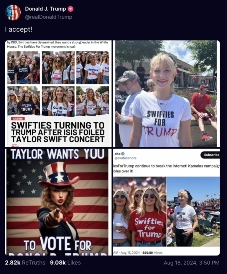Ο Ρεπουμπλικανός υποψήφιος για την προεδρία ανήρτησε το μήνυμα «Αποδέχομαι!» συνοδευόμενο από φωτογραφίες, οι οποίες είχαν ληφθεί από άλλους λογαριασμούς στα μέσα κοινωνικής δικτύωσης. Πολλές από αυτές φαίνεται να δημιουργήθηκαν με τη χρήση τεχνητής νοημοσύνης. Η ανάρτηση προκάλεσε τις έντονες αντιδράσεις των θαυμαστών της Σουίφτ, γνωστών ως Swifties, οι οποίοι κατηγόρησαν τον Τραμπ για διασπορά παραπληροφόρησης.