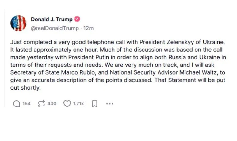 Ο Ντόναλντ Τραμπ πραγματοποίησε μία ανάρτηση για την συνομιλία διάρκειας μιας ώρας με τον Ζελένσκι, την οποία χαρακτήρισε «πολύ καλή»