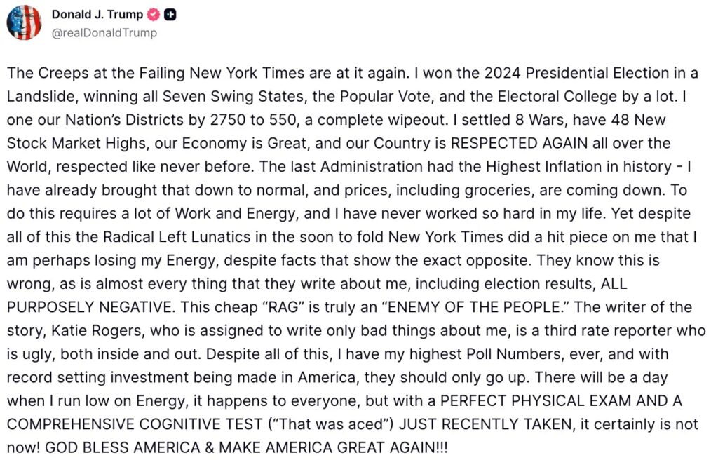 «Οι New York Times εξαπέλυσαν επίθεση λέγοντας ότι μπορεί να είμαι λιγότερο ενεργητικός όταν τα γεγονότα δείχνουν το αντίθετο», έγραψε προφανώς εξοργισμένος ο Τραμπ.