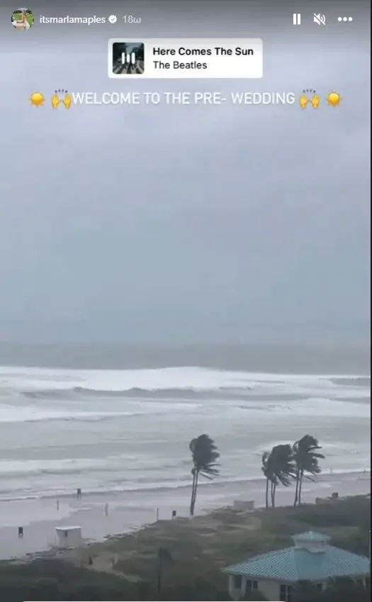 Η τροπική καταιγίδα αναμένεται να μετατραπεί σε τυφώνα κατηγορίας 1 πριν φτάσει στην ξηρά απόψε. Ωστόσο, η Μάρλα, πάντα αισιόδοξη, έβαλε στο βίντεο τη μουσική του «Here Comes The Sun» των Beatles εν όψει του γάμου της κόρης της το Σάββατο. «Καλώς ήλθατε στο προγαμιαίο ταξίδι» έγραψε στη λεζάντα.