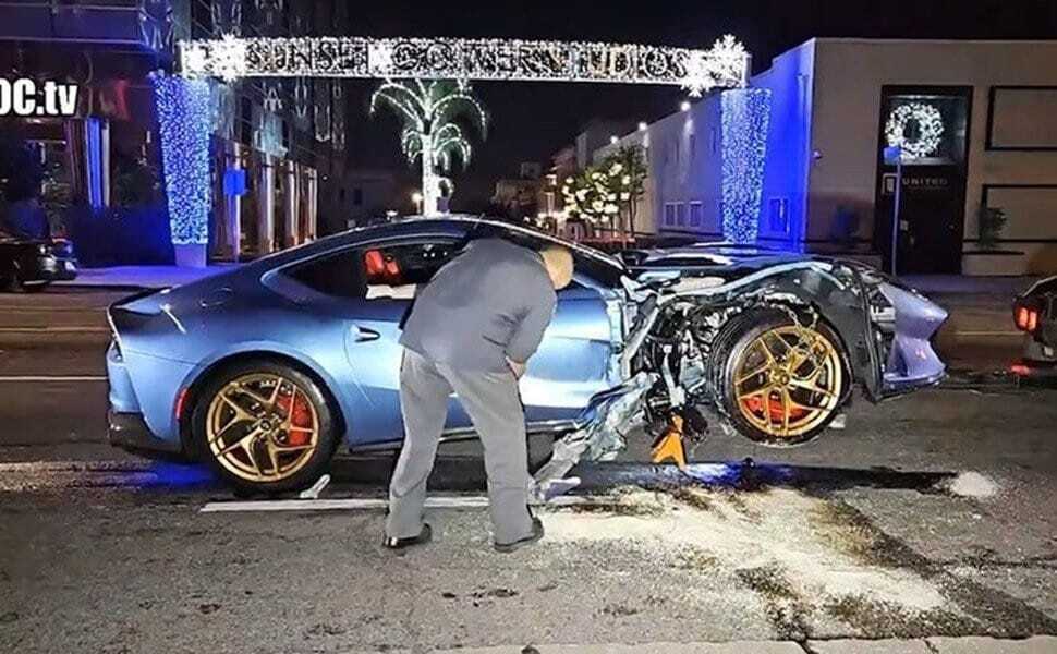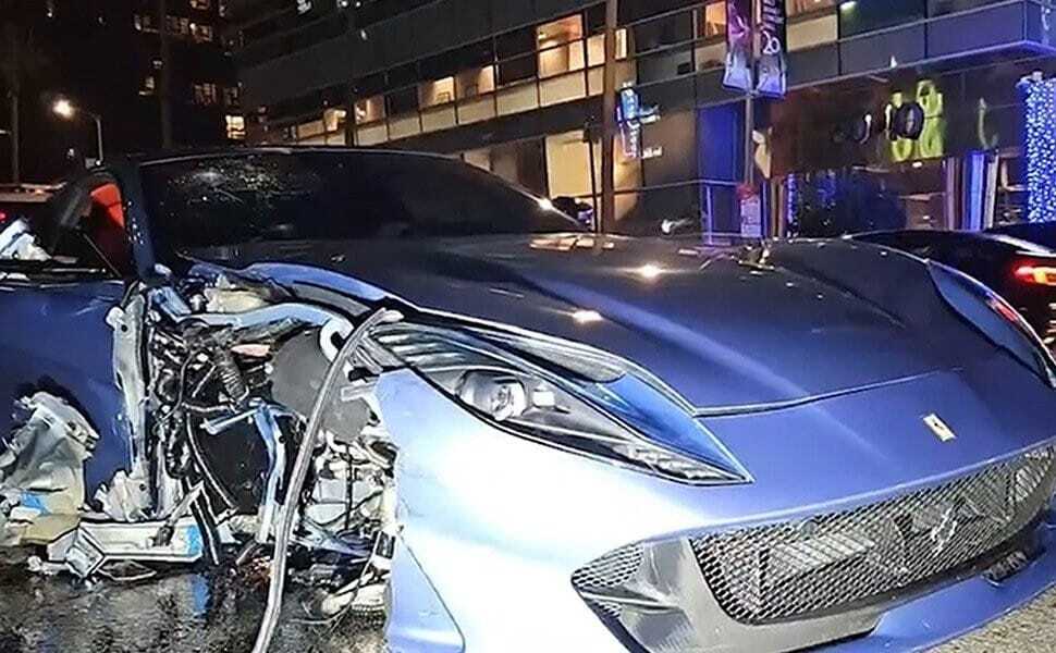 Οι εικόνες δείχνουν τη Ferrari χτυπημένη στην πλευρά του συνοδηγού με τον τροχό διαλυμένο, την ανάρτηση, την πόρτα του συνοδηγού εντελώς «σκισμένη» και το μπροστινό παρμπρίζ ραγισμένο.