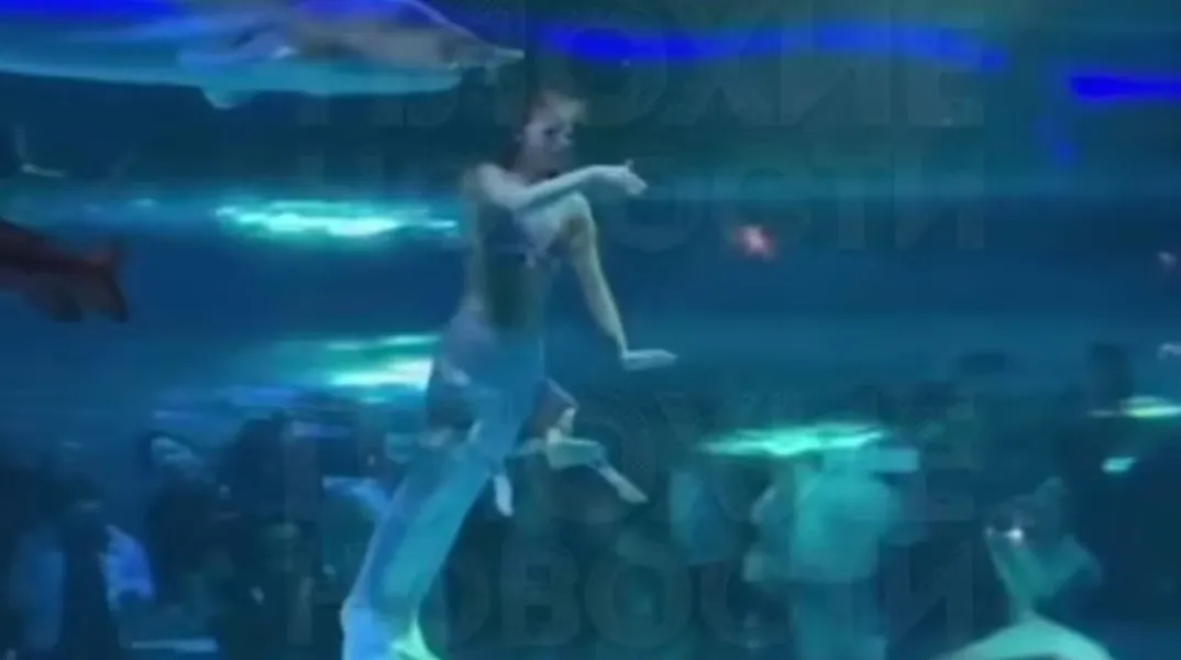 Η «γοργόνα» χορεύει μέσα στο νερό παρέα στα δεκάδες σπάνια ψάρια. Παράλληλα, γνέφει με το χέρι της στις οικογένειες καθώς τα ψάρια κολυμπούν δίπλα της. Όμως, ένα από τα μεγάλα ψάρια του ενυδρείου την πλησίασε και προσπάθησε να την αρπάξει από το κεφάλι σφίγγοντας τα σαγόνια του.