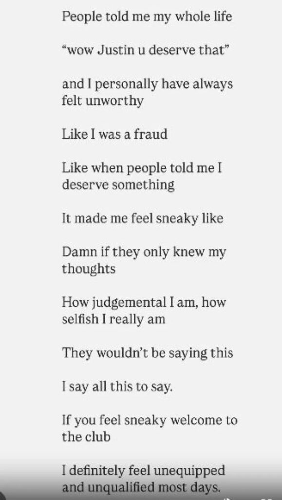 «Οι άνθρωποι μου έλεγαν όλη μου τη ζωή “ουάου Τζάστιν, το αξίζεις αυτό” και προσωπικά πάντα ένιωθα άξιος,» έγραψε ο 31χρονος καλλιτέχνης, σύμφωνα με το E! News. «Σαν να ήμουν απατεώνας. Όταν οι άνθρωποι μου έλεγαν ότι το αξίζω, με έκανε να νιώθω ύπουλος, σαν να ήξεραν τις σκέψεις μου.”»