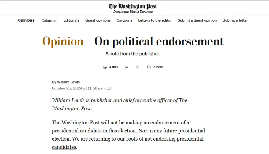 Η απόφαση της Washington Post έρχεται την ίδια στιγμή που η εφημερίδα New York Post, ιδιοκτησίας του Ρούπερτ Μέρντοκ, προέβη σε υποστήριξη του Τραμπ, αναδεικνύοντας τις πολιτικές διαφορές των δύο μέσων. Αντίστοιχα, προ ημερών παραιτήθηκε η Μαριέλ Γκάρζα, διευθύντρια σύνταξης στους Los Angeles Times, σε ένδειξη διαμαρτυρίας για την απόφαση του ιδιοκτήτη Πάτρικ Σουν-Σιονγκ να αποσύρει την υποστήριξη στην υποψηφιότητα της Χάρις.