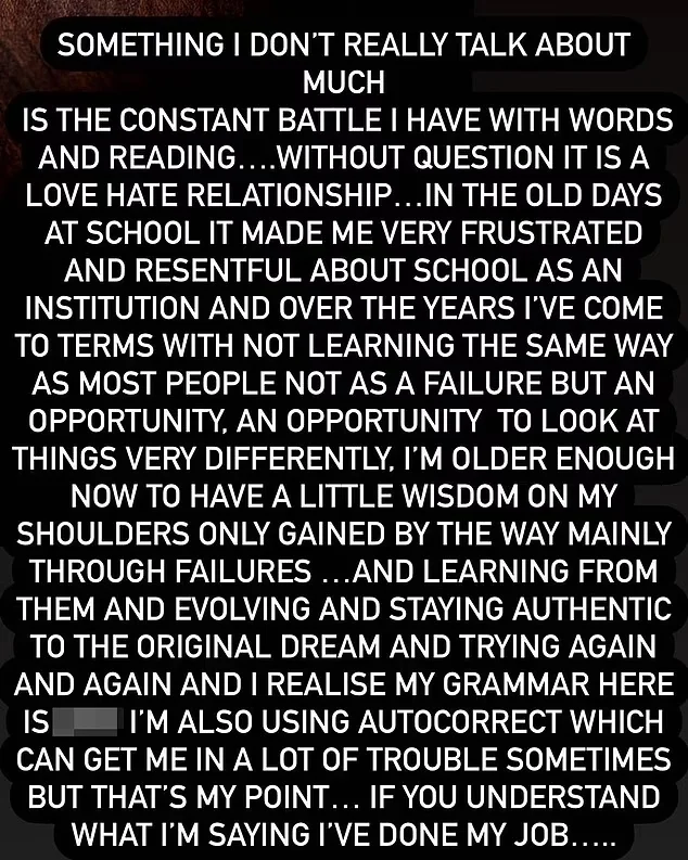 Ξεκινώντας με την πρόταση: «Κάτι που δεν συζητώ συχνά είναι η συνεχής μάχη που έχω με τις λέξεις και την ανάγνωση…», εξήγησε ότι έχει «συμβιβαστεί» με το γεγονός ότι δεν μαθαίνει με τον ίδιο τρόπο όπως οι άλλοι.