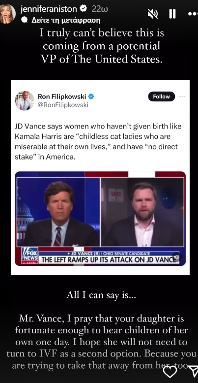 Ο 39χρονος Βανς δεν δίστασε να μιλήσει με προσβλητικά λόγια και για την αντιπρόεδρο των ΗΠΑ Κάμαλα Χάρις, ενώ έκανε ασεβή σχόλια κατά γυναικών και της εξωσωματικής γονιμοποίησης. Η 55χρονη Τζένιφερ Άνιστον ανήρτησε στο Instagram ένα story που δείχνει ένα βίντεο με τον Βανς να μιλάει στον Τάκερ Κάρσον στο Fox News.