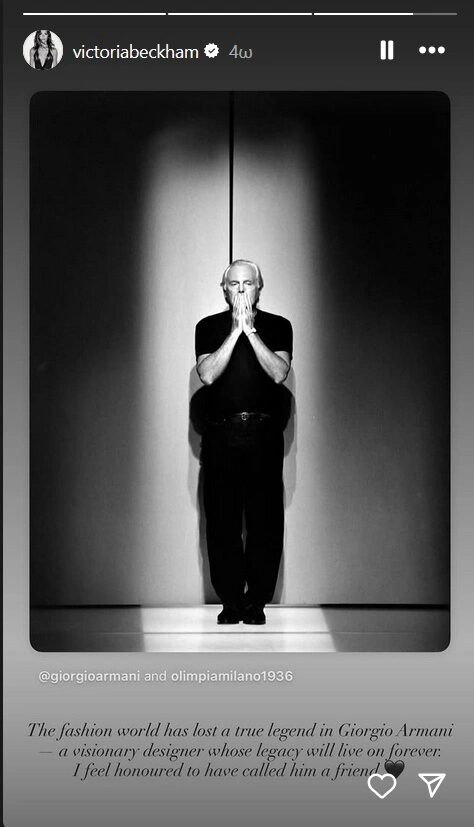 «Ο κόσμος της μόδας έχασε έναν πραγματικό θρύλο, τον Τζιόρτζιο Αρμάνι — έναν οραματιστή σχεδιαστή, η κληρονομιά του οποίου θα ζει για πάντα. Νιώθω τιμή που τον αποκαλούσα φίλο μου», έγραψε το πρώην μέλος των Spice Girls Βικτώρια Μπέκαμ με story της στο Instagram.