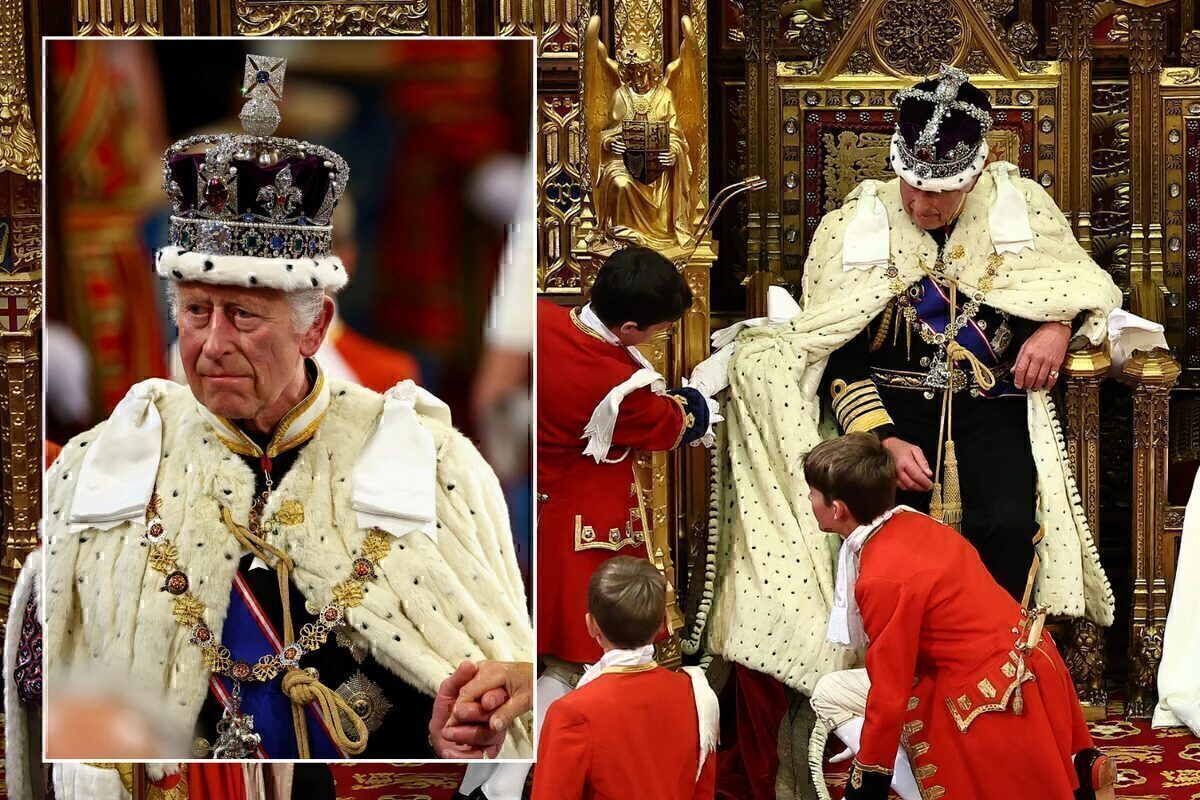 Καθώς οι άντρες των τιμών γονάτισαν για να προσαρμόσουν την ερμίνα και τη βελούδινη ρόμπα, κάποιος άπλωσε ένα τμήμα της ρόμπας από το χέρι του μονάρχη προτού απομακρυνθεί. Ο βασιλιάς Κάρολος έκανε επανειλημμένα χειρονομία με το χέρι του να μετακινήσει το κομμάτι, και ο άντρας απάντησε διπλώνοντας την κάπα πάνω από το θρόνο.